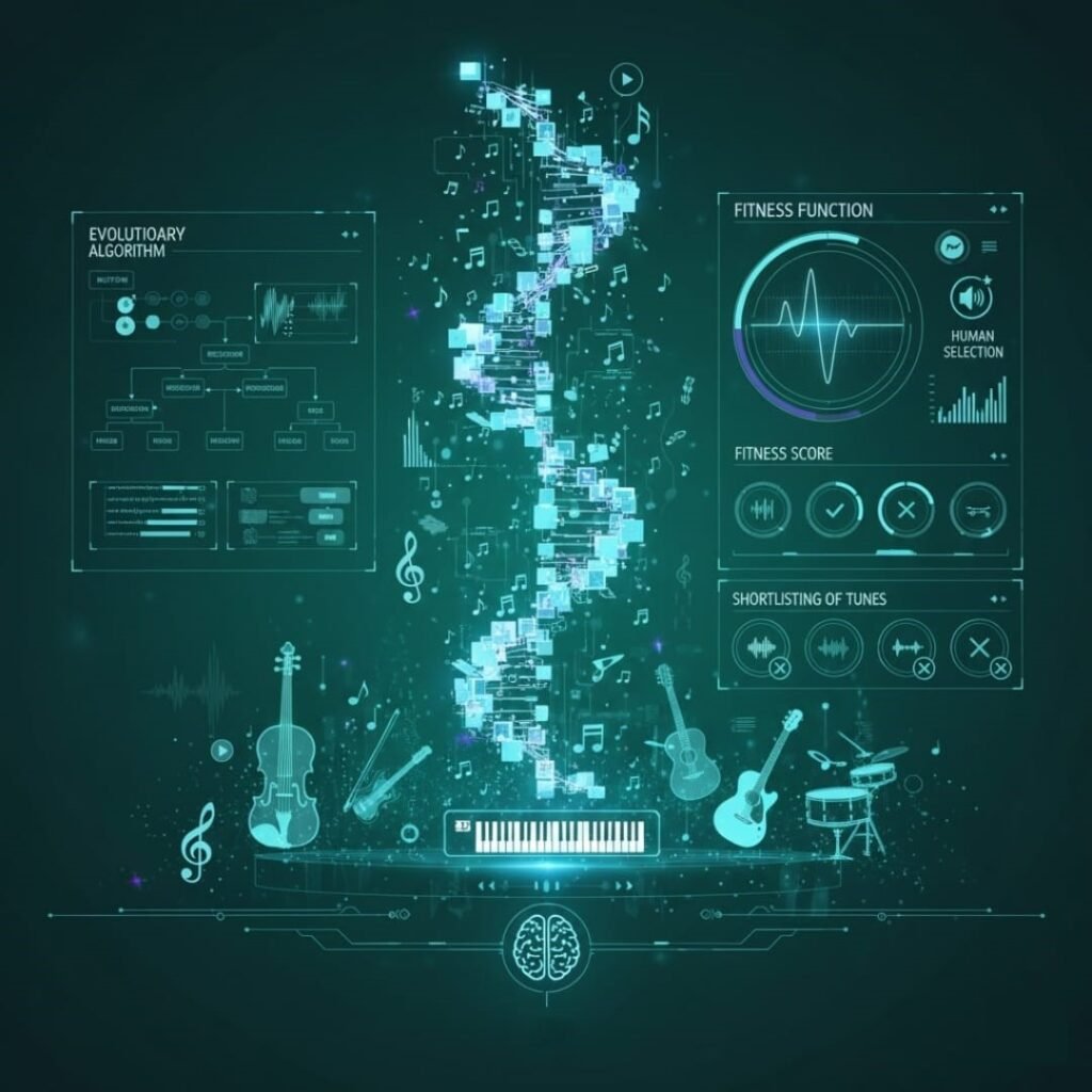 To produce unique and valuable music, researchers argue that machines could build on evolutionary algorithms. To build a machine based on such an algorithm, it must begin with initial musical phrases along with a rudimentary algorithm that imitates reproduction and random mutations by swapping a few parts, merging others, and changing random notes. With this, the machine is able to generate new phrases and use a “fitness function”. Like biological fitness that can be determined through external environmental pressures, the fitness function in the music algorithm can be identified using an external melody selected by real musicians or music listeners that represent attractive melody. The algorithm can use initial phrases and external melodies to choose similar phrases. It can also discard the least similar sequences and apply mutation and recombination to the remaining phrases, and choose the closest phrases to the initial ones and external melodies, the process repeated until the final outcome is achieved, prompted by the user. This process is complex and random that it can pass the Lovelace test. The inclusion of human input could allow to produce beautiful melodies.