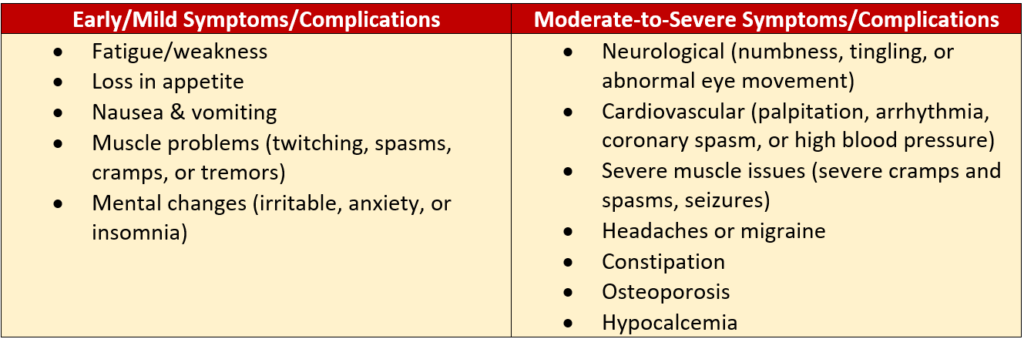 Our body informs us about magnesium deficiency through several ways that can be categorized into early/mild symptoms and moderate-to-severe symptoms. This indicators are also referred to as complications arising due to low magnesium levels. The below Table summarizes the indicators/complications: